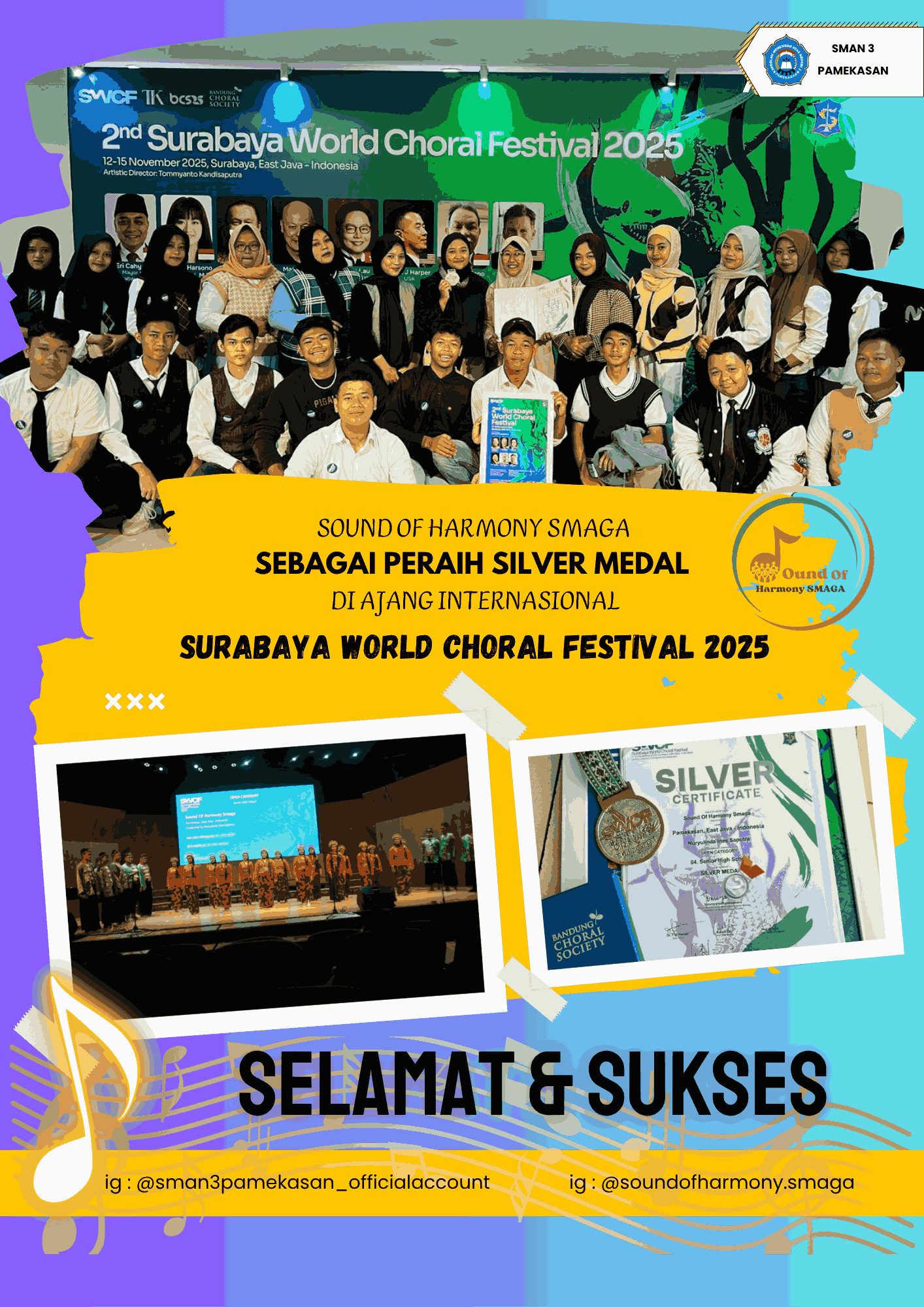 Momen membanggakan kembali terulang, Paduan Suara SMAN 3 Pamekasan yakni Sound Of Harmony Smaga berhasil membawa pulang kemenangan gemilang dari ajang kompetisi Internasional Surabaya World Choral Festival 2025 pada 12-15 November 2025 di Balai Pemuda Surabaya. Prestasi ini bukan sekadar piala atau medali, melainkan penegasan bahwa kerja keras, disiplin dan jiwa seni anak bangsa mampu bergaung indah melintasi batas-batas geografis.